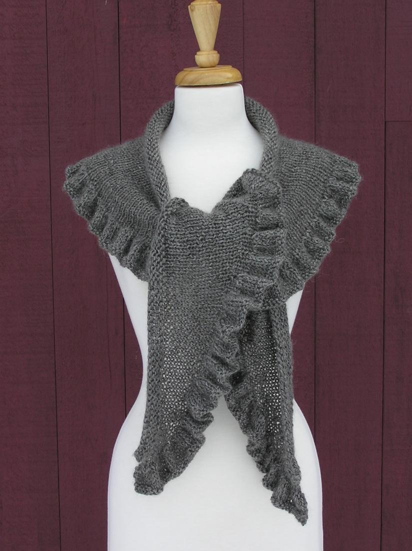 Ruffles Scarf Ruffles Scarf Designed by Laura Chau. A blend of sophistication and practical warmth. Advanced level pattern. Hand knit price: $125 plus S&H Yarn (skein sizes vary) plus pattern approximately $55 plus S&H Asymmetrical Shawl: Original design concept by Yarns for Your Soul, Manchester, VT this version by Bear Mountain Farm. A new twist on the classic shawl with an art deco edge. A great way to layer. Very easy pattern. Hand knit price: $150 plus S&H Yarn (skein sizes vary) plus pattern approximately $52 plus S&H